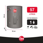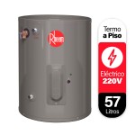 Termo eléctrico de piso monofásico de 57 litros marca Rheem, ideal para espacios reducidos y bajo mesada gracias a sus conexiones laterales. Con esmaltado de porcelana Bi-Capa en el estanque y ánodos de magnesio protegen su interior y que alargan su vida útil.