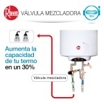 Los termos murales Rheem son durables y seguros. Su esmalte Zafiro Xpand de baja adherencia al sarro protege el tanque interno y las resistencias de acero inoxidable, alargando la vida útil del termo eléctrico. Cuenta además con ánodo de magnesio resistido AR Protect X4, sistema electroestático que atrae partículas de magnesio a las paredes internas del tanque, evitando su deterioro y aumentando su vida útil.